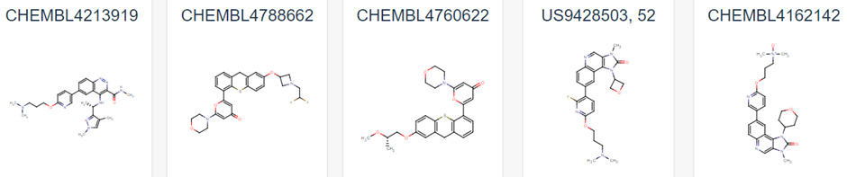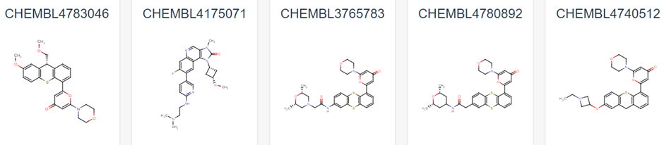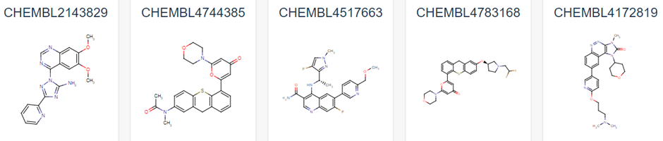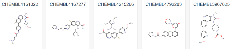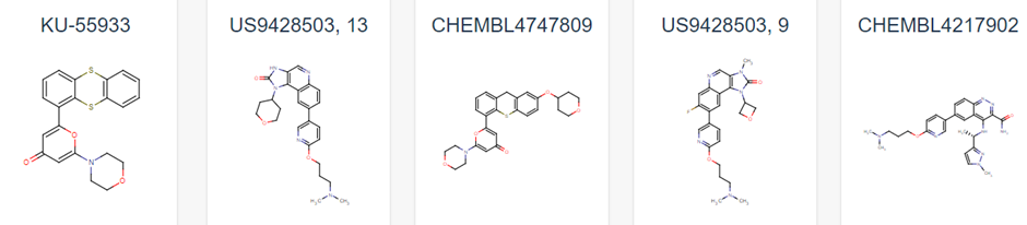 Figure 1 demonstrates some of these established chemical entities, focussing on those that are relatively selective to ATM and have favourable in vivo potency scores. Potentially, all of these could be used as ligands for the potential PROTAC molecule, but this may lead to intellectual property concerns. As can be observed in Figure 1, all have a backbone structure with various sets of aromatic rings, often with three fused together and 1 or 2 rings attached via a methyl group. This observation, as well as the whole 159 ligand list within the database opens up opportunity into rational design for a novel ligand. We could use a variety of open-source Quantitative Structure Activity Relationship (QSAR) algorithms in order to adapt these drugs. These molecules will have been optimised for their affinity to ATM in their in vivo studies, and as such we can adjust them to have better pharmacokinetic properties as affinity won’t matter as much in a PROTAC design (4). We would be focussing on aqueous solubility, cell permeability and obtaining low blood-brain-barrier permeability. As such, we suggest that the BioPPSy platform should be used in this study in order to optimise the PROTAC ligand identified, as this software focusses on these pharmacokinetic properties (6). Through this software, we propose designing a list of PROTAC ligand molecules for ATM, which will then be later validated experimentally in Aim 2.
