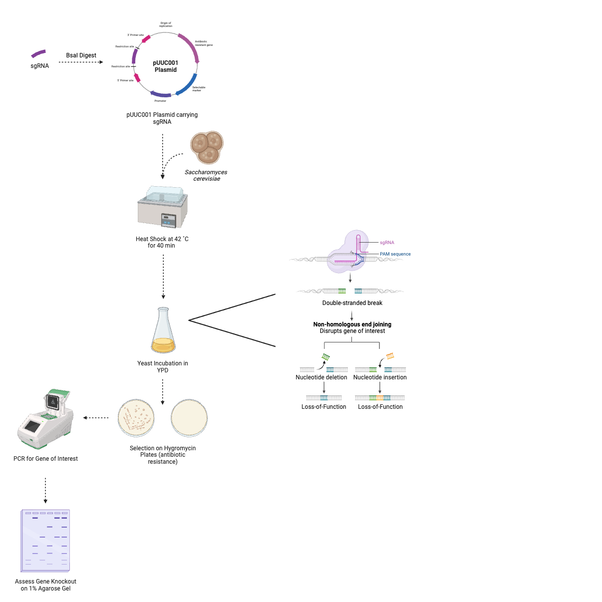 The transformation of Saccharomyces cerevisiae colonies with pUCC001 plasmids carrying gRNA will be carried out in a series of simple steps. A single colony from a plate containing growth medium will be selected, then inoculated in YPD broth overnight. The transformation mix (50% PEG 3350, lithium acetate, carrier DNA) and pUCC001 plasmid will be added to yeast colonies of uniform concentrations, quantified by optical density at 600 nm. Cells will be heat-shocked at 42 ˚C in a water bath for 40 minutes. This encourages yeast uptake of the plasmids. Following this, cells will be left for incubation at 30 ˚C. Cells will then be centrifuged, and then resuspended in YPD media. Transformed yeast cultures will be plated onto YPD + hygromycin plates. Hygromycin is an antibiotic that would usually not allow the growth of yeast on plates. However, the pUCC001 plasmid encodes a gene for resistance to hygromycin. This means that only yeast cells that have undergone successful plasmid transformation will grow. The plates will be left to dry, then incubated 30 ˚C for 3-5 days, or until colonies appear (10).