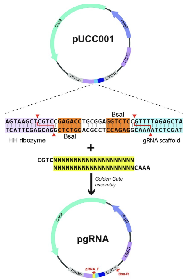 A pUUC001 plasmid (AddGene plasmid #124451) will be used to drive expression of our CRISPR system components (Figure 1). This plasmid is optimal for use of co-expression of both the Cas9 endonuclease and a guide RNA in a range of species, including Saccharomyces cerevisiae (10). This plasmid has been selected for its ease of use in terms of gRNA cloning into the plasmid in a single-tube reaction. Golden gate cloning allows for directional assembly of the plasmid with the gRNA. BsaI endonuclease cut sites flank the gRNA cloning site on the pUUC001 plasmid. The cut site is uniquely non-palindromic, meaning the same endonuclease can be used at two sites, without the risk of insertion of the gRNA into the plasmid in the incorrect orientation (11).