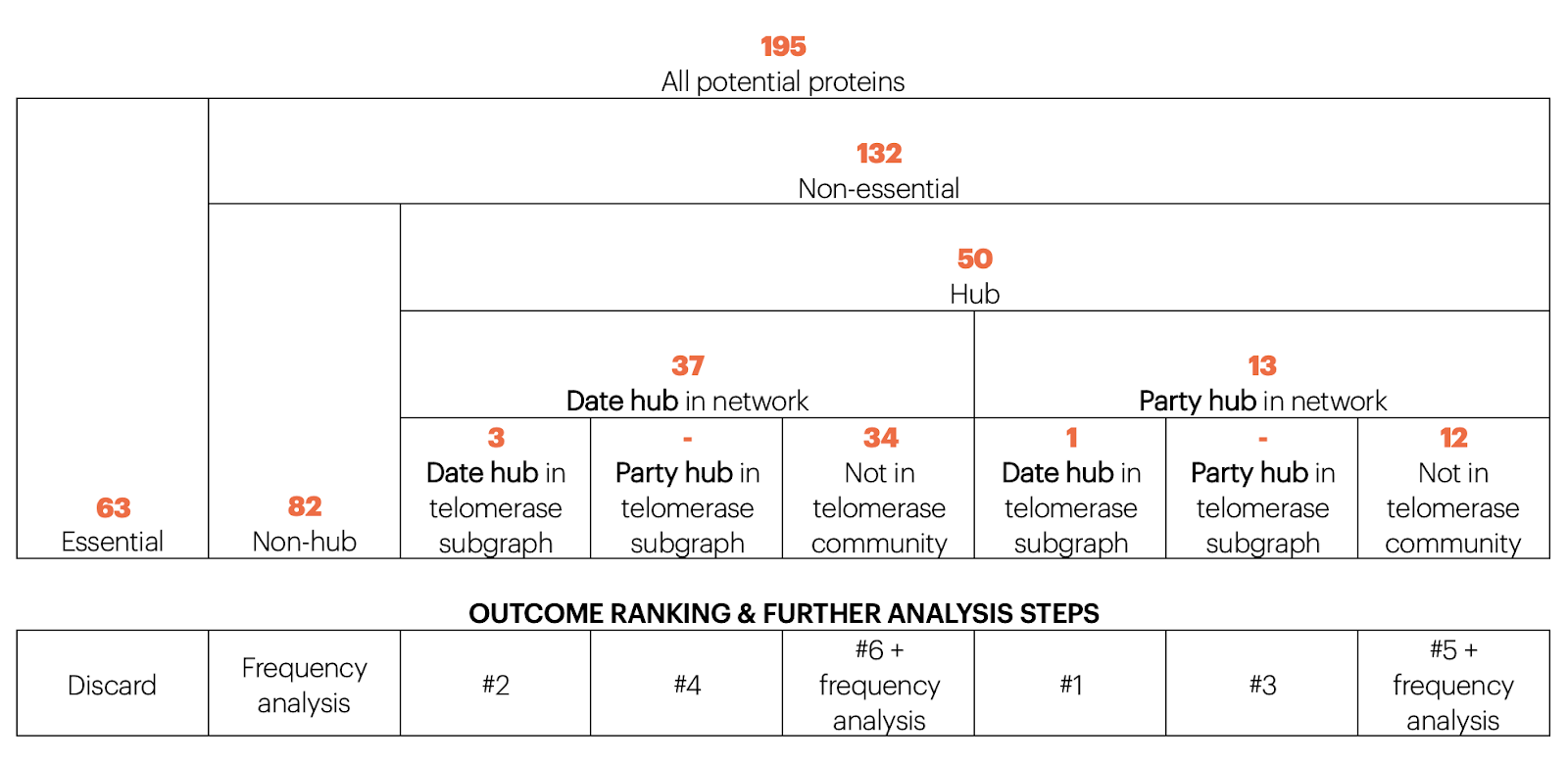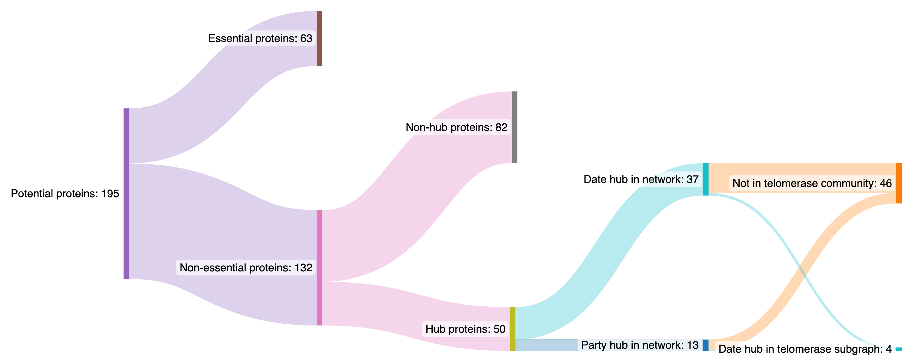 To reduce chance of cell lethality we prefer party hubs to date hubs and preferentially party hubs within the telomerase community as this is the target community. However, within the telomerase community we aim to cause fairly serious disruption and so we would prefer proteins which are date hubs within telomerase. Taking this together we arrive at the following decision tree for the potential protein list: